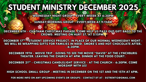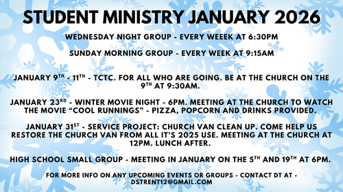 Sunday Morning Group will be at 9:15 with DT - for middle and high school students (Grades 6-12)